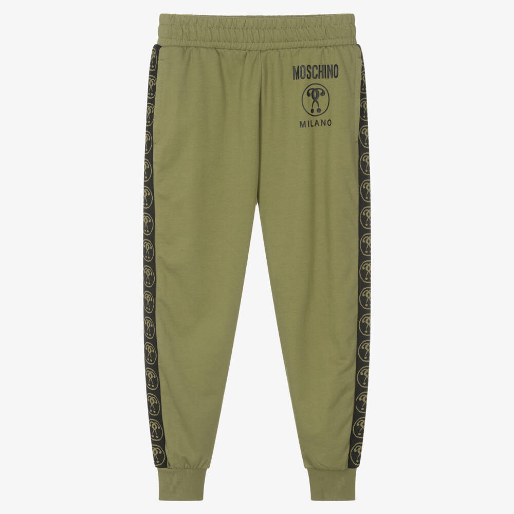 Khaki green Mini-me joggers for boys and girls from Moschino Kid-Teen, with convenient side pockets. Made in soft, stretchy and mid-weight jersey, the fabric has a fleecy-feel underside for added cosiness. The waistband is elasticated with inner drawstrings to ensure a comfortable fit on little tummies. Double Question Mark logo tape can be found on the sides and a black logo graphic is stamped on the front to complete the look.