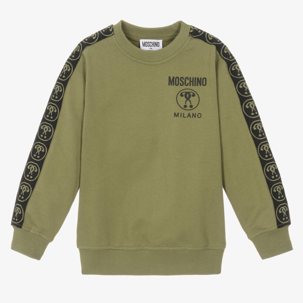 A khaki green Mini-me sweatshirt for boys and girls from Moschino Kid-Teen. Made in soft, stretchy and mid-weight jersey, the fabric has a fleecy-feel underside for added cosiness. Double Question Mark logo tape can be found on the sleeves and a black logo graphic is stamped on the front to complete the look.