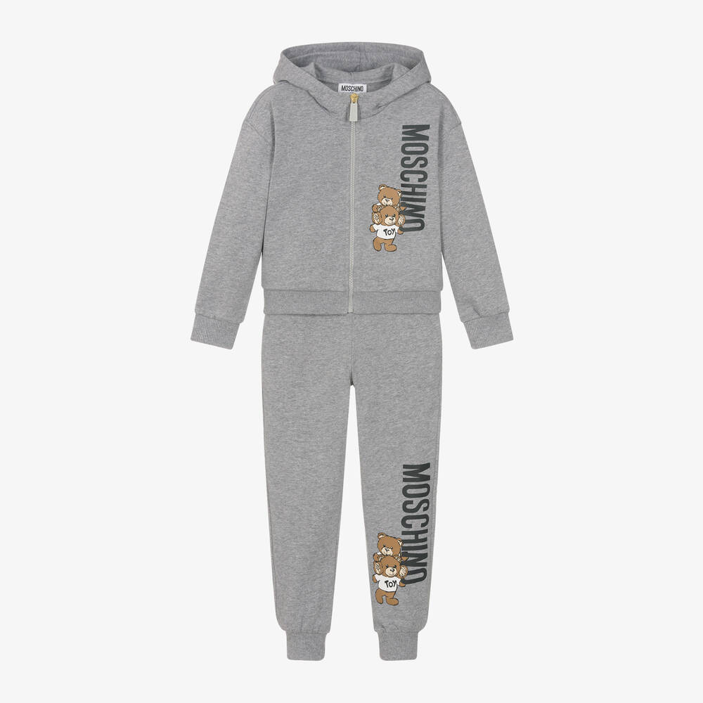 Grey marl tracksuit for boys and girls by Moschino Kid-Teen, made in soft and mid-weight cotton jersey. For instant designer appeal, both pieces are printed with a bold black logo and the Italian designer's Teddy Bears. Ideal for layering over T-shirts, the zip-up hoodie has useful side seam pockets and ribbed trims. The matching cuffed joggers have concealed pockets and a comfortable, stretchy waistband.