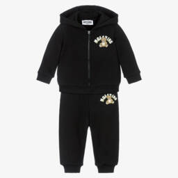 Casual, grey marl tracksuit for little boys and girls by Moschino, made in soft cotton-blend jersey with a warm, fleecy inside. The zip-up hoodie features the brand's black logo print on the front and the iconic Teddy Bear logo on the back. The coordinating joggers have a comfortable elasticated waistband and simply pull up.