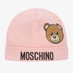 Grey marl layette hat for baby boys and girls by Italian brand Moschino Baby, made in soft and stretchy cotton jersey. This adorable accessory has the brand's signature Moschino Teddy Bear on the front, along with a bold black logo print on the turned-up brim. It is fully lined for added comfort.