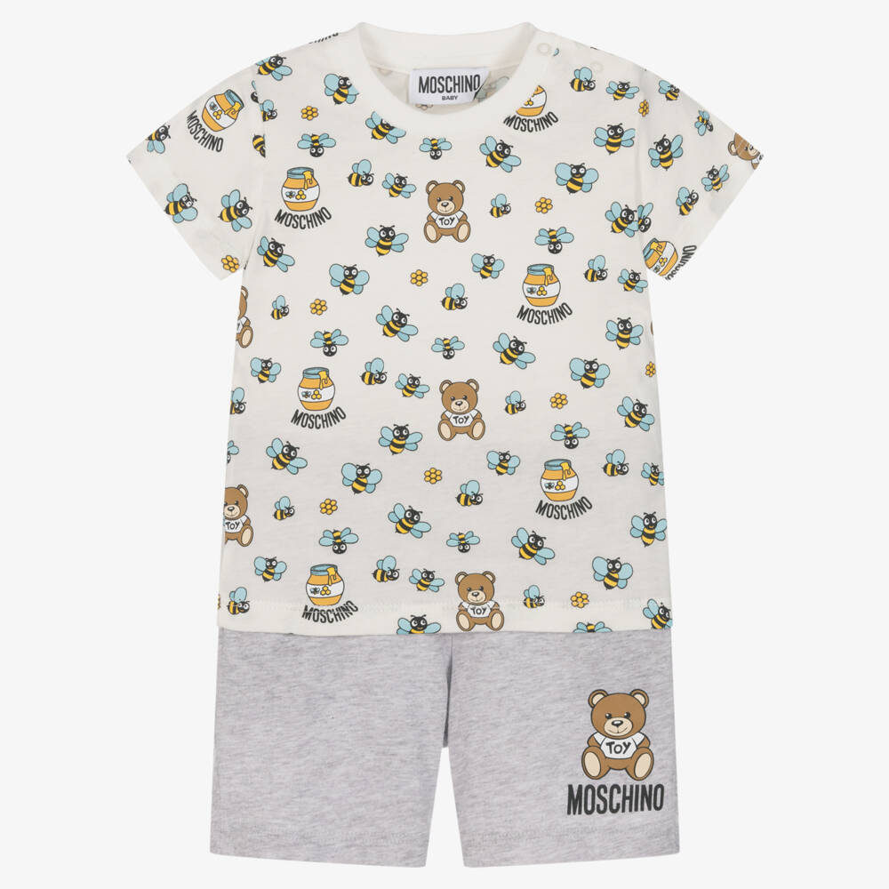 So adorable, a pale ivory T-shirt and grey marl shorts set for little boys and girls from Moschino Baby. The top has an all-over Moschino Teddy Bear logo, bees and honey pot prints with a soft ribbed neckline and easy poppers on one shoulder. The pull-on shorts have an elasticated waistband, pockets on the side seams and a further logo print on one leg. Made from super soft and lightweight cotton jersey, the set is sure to elevate the little ones's casual look.