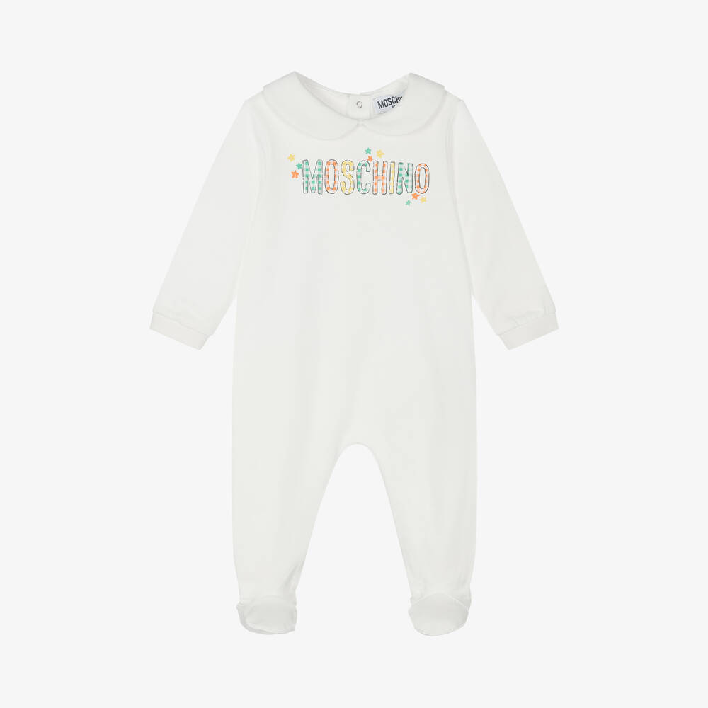 An ivory cotton babygrow for boys and girls by Moschino Baby. This sweet style is made in comfortable jersey with a cosy brushed feel inside for a gentle feel against the skin. Designed with a rounded collar and ribbed cuffs, it has a logo motif on the front in green, orange and yellow gingham-effect print. There are popper fastenings on the back.