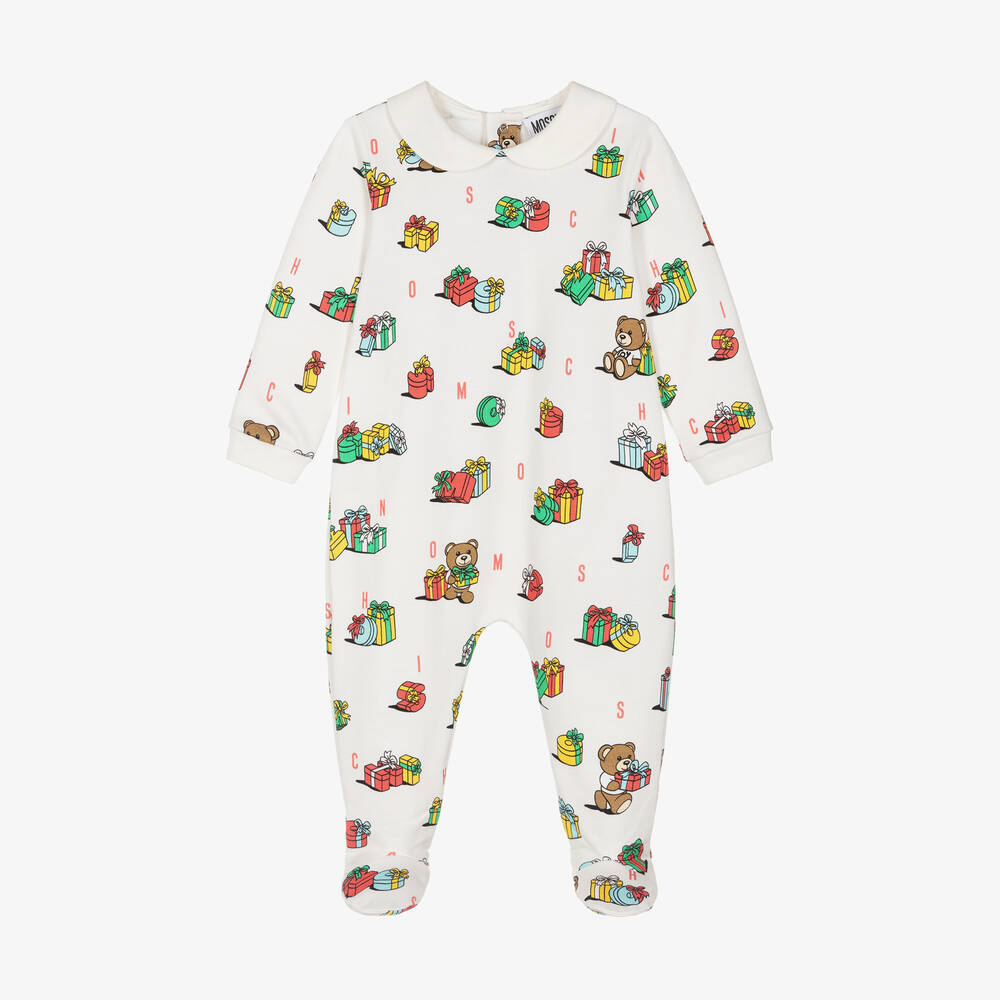 Lovely for the festive season, this ivory cotton babygrow for boys and girls is by Moschino Baby. Made in soft, mid-weight jersey for comfortable wear, this cute one-piece is patterned with bright and colourful logo gifts and features the brand's iconic Moschino Teddy Bear. It has a sweet Peter Pan collar and stretchy ribbed cuffs, with poppers on the back for quick dressing.