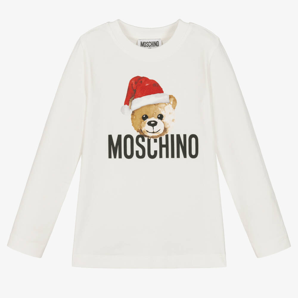 An ivory top for boys and girls by Italian label Moschino Kid-Teen. Comfortable on the skin, it is made in soft and stretchy cotton jersey. On the front is a beige Moschino Teddy Bear print, with a red Santa hat and black spell-out logo beneath.