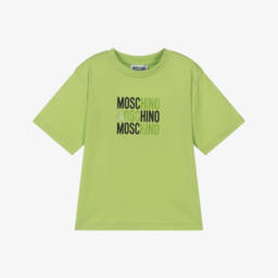 Ivory maxi T-shirt for boys and girls by Moschino, made in soft cotton jersey. Casual and comfortable, this short-sleeved style has a triple logo printed on the front in black and grey for instant brand recognition.