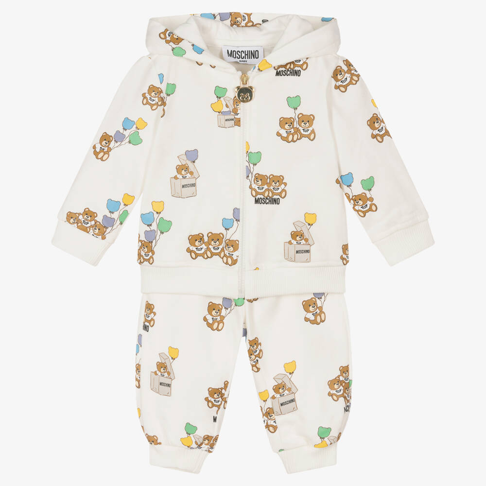 Cute cotton tracksuit for little boys and girls by Italian designer Moschino Baby, patterned with the brand's signature Teddy Bear and adorable colourful balloons. The set is made in comfortable jersey with a brushed feel inside and ribbed trims for extra cosiness. The front zip fastening on the hooded top has a golden Teddy Bear pull tab as an extra designer touch.