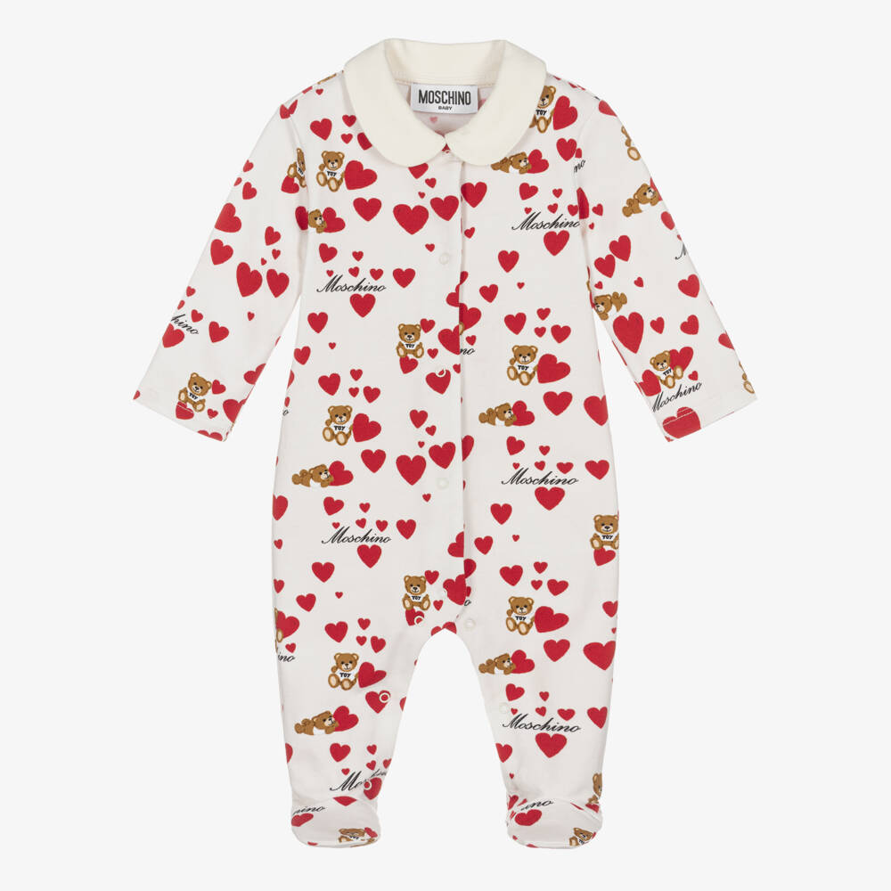 Ivory babygrow for girls by Moschino Baby, made in soft and stretchy cotton jersey, with a warm fleecy inside. It is patterned with pretty red hearts, black logos and Moschino Teddy Bears. There is a sweet rounded collar and popper fastenings on the front and between the legs.