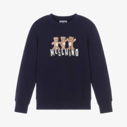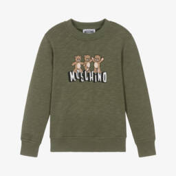 Khaki green sweatshirt for boys and girls by Moschino, featuring three dancing Moschino Teddy Bears and a bold white logo for a fun designer look. Cosy and comfortable for casual days, it is made in soft, looped-back cotton jersey.