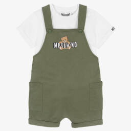 Khaki green and white cotton jersey dungaree set for little boys and girls by Moschino, featuring the brand's Teddy Bear logo for an adorable designer look. The dungarees have a partly elasticated waist for a comfortable fit and branded poppers on the straps for easy, adjustable fastening. Completing the set is a white tee with a black logo on one of the rolled-up sleeves.