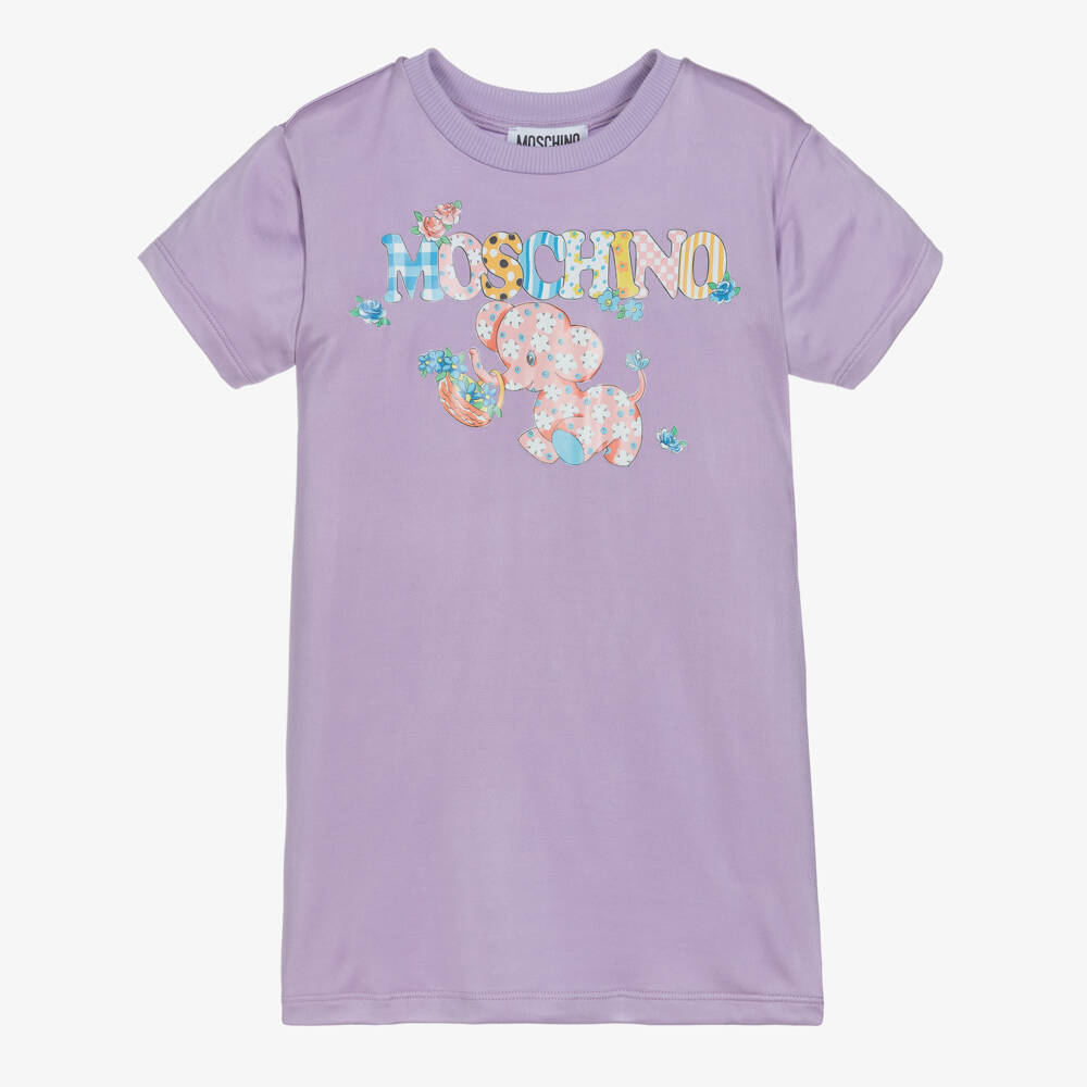 Lilac purple T-shirt dress for girls by Moschino Kid-Teen, inspired by the adult collection. This comfortable piece is made in soft, stretchy viscose jersey with a lovely sheen. There is a ribbed crew neckline and a vintage-style floral baby elephant and logo print on the front.