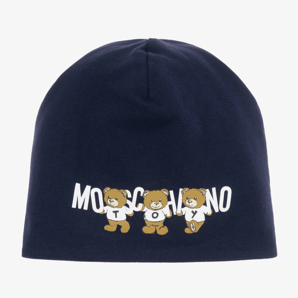 A navy blue beanie hat for boys and girls by Moschino Kid-Teen. Printed on the front is a bold Moschino Teddy Bear logo design for a fun branded look. Comfortable to wear, it is made from soft cotton jersey.