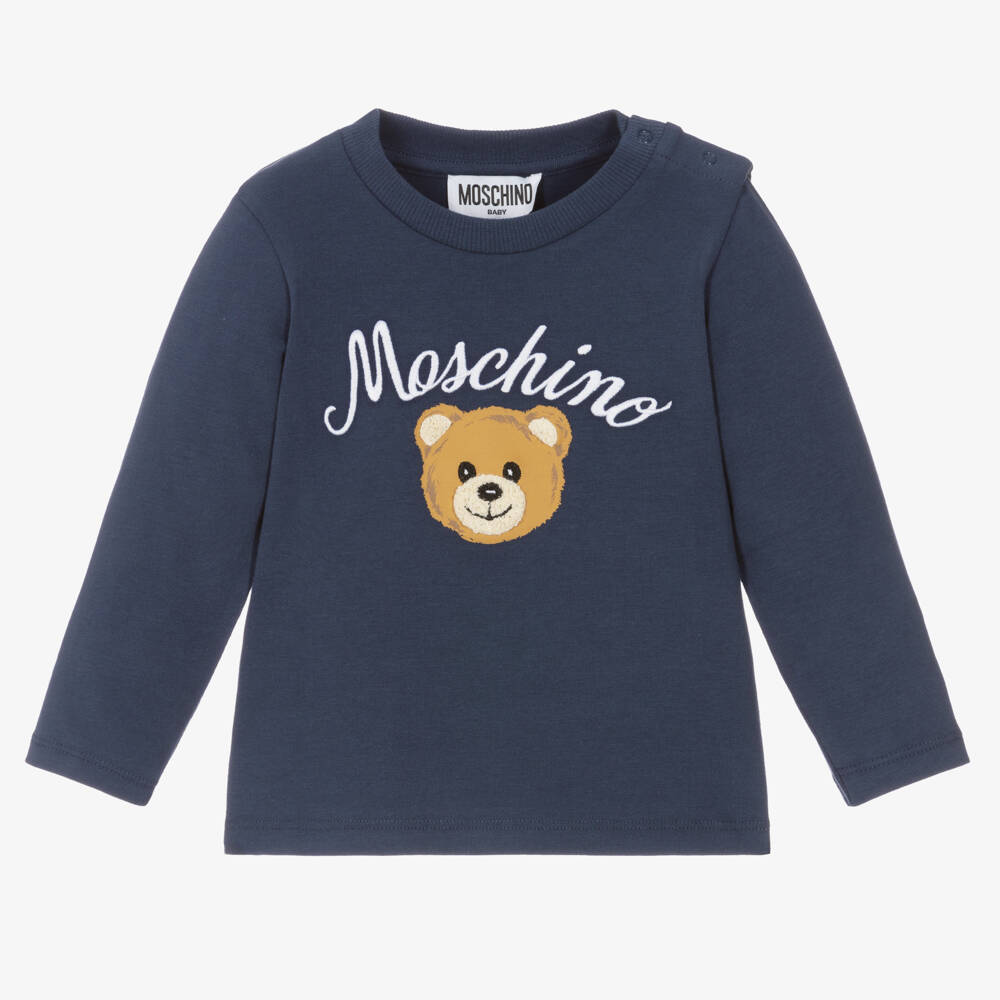 Cute navy blue long-sleeved top for little boys and girls by Moschino Baby. Made from soft cotton jersey for a comfortable wear, it has an embroidered logo on the front and a sweet Moschino Teddy Bear motif with boucle trims. There are practical popper fastenings on one shoulder and a lightly ribbed crew neckline.