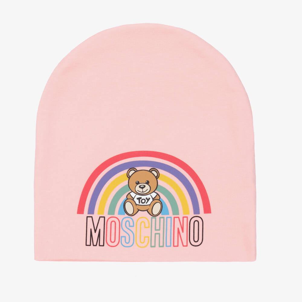Baby girls pink cotton jersey hat by Moschino Baby. Soft and stretchy, it has a colourful rainbow logo print with the designer's signature brown Teddy Bear.