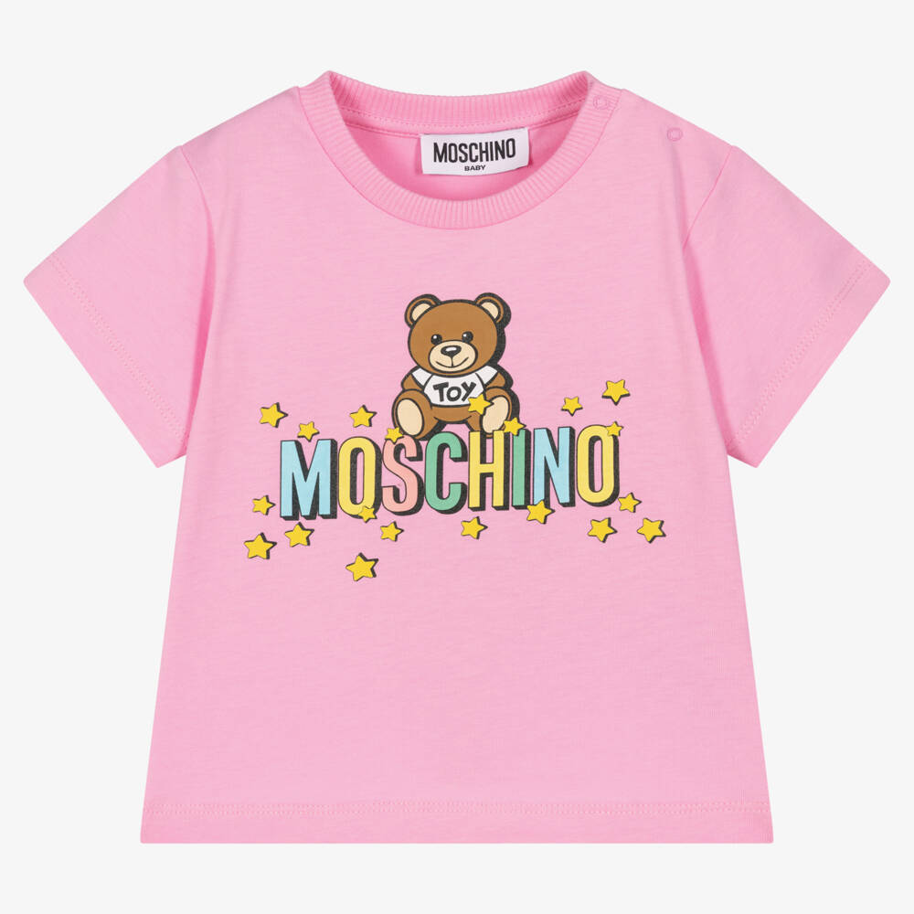 Wonderful rose pink T-shirt for little girls by Italian brand Moschino Baby, made in the softest organic cotton jersey. It has the brand's signature Teddy Bear graphic, with a colourful logo and stars printed on the front. There are useful popper fastenings on one shoulder.