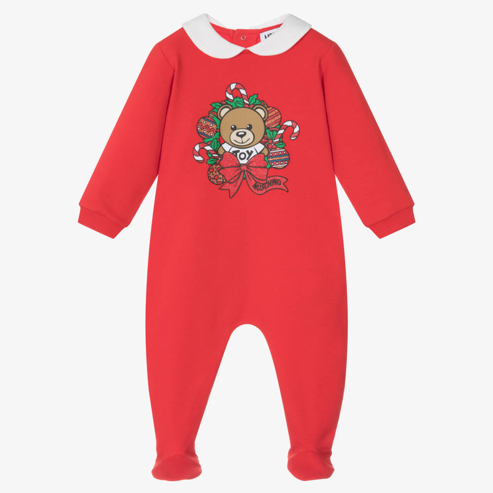 Bright red cotton babygrow for boys and girls by Moschino Baby, made from soft jersey with a cosy fleecy interior. Designed for the festive season, it has an adorable Moschino Teddy Bear surrounded by baubles and candy canes printed on the front. There is a cute white Peter Pan collar and popper fastenings on the back and down one leg for easy dressing.