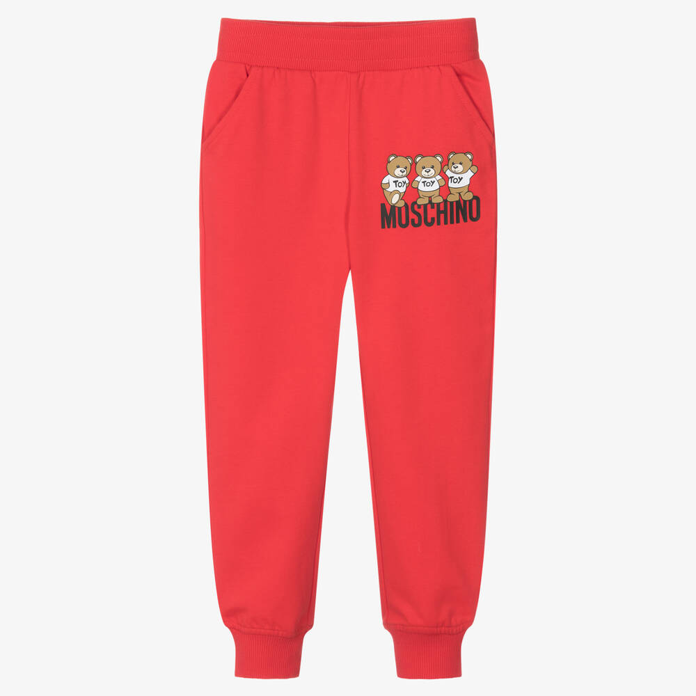 Casual red joggers for boys and girls by luxury Italian fashion house Moschino Kid-Teen. For a signature look, they are printed with the brand's iconic Moschino Teddy Bears and a black logo print on the front. Made in soft cotton jersey with useful front pockets, they have an elasticated waist with internal drawstring ties for an ideal fit.