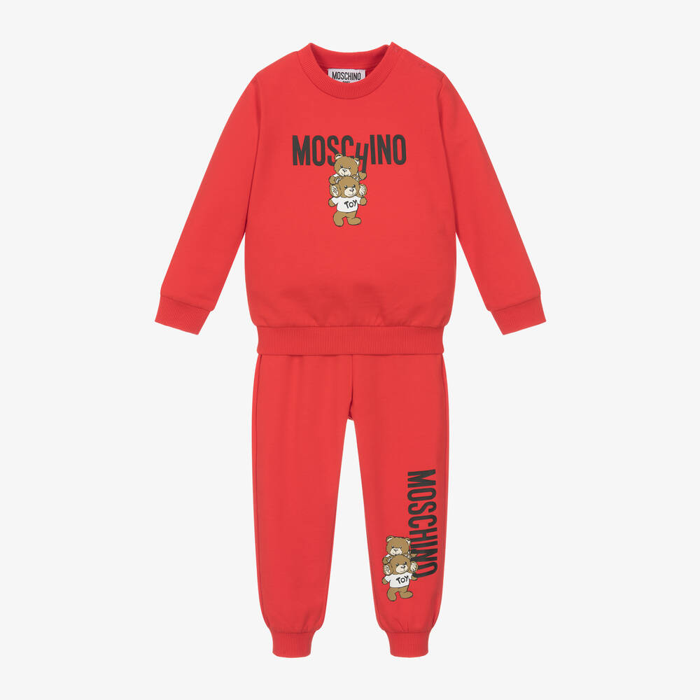 Bright red tracksuit for little boys and girls by Moschino Baby, made in soft cotton jersey for comfort as well as style. The long-sleeved sweatshirt has a playful logo print on the chest with two cuddly Moschino Teddy Bears. Great for layering, it has ribbed trims and easy shoulder poppers on one side. Matching joggers, with a stretchy ribbed waistband, are easy to pull up and take off.