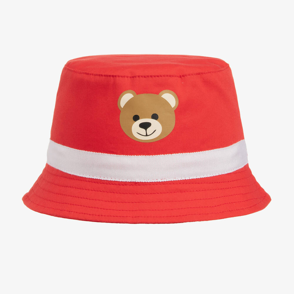 Little boys and girls red sun hat, by Moschino Baby. Woven in soft cotton twill, this cute style has the brand's instantly recognisable Moschino Teddy Bear on the front. The brim has a white band and is ideal for keeping the sun away from your little one's face. It has a soft cotton lining for comfort on babies gentle skin.