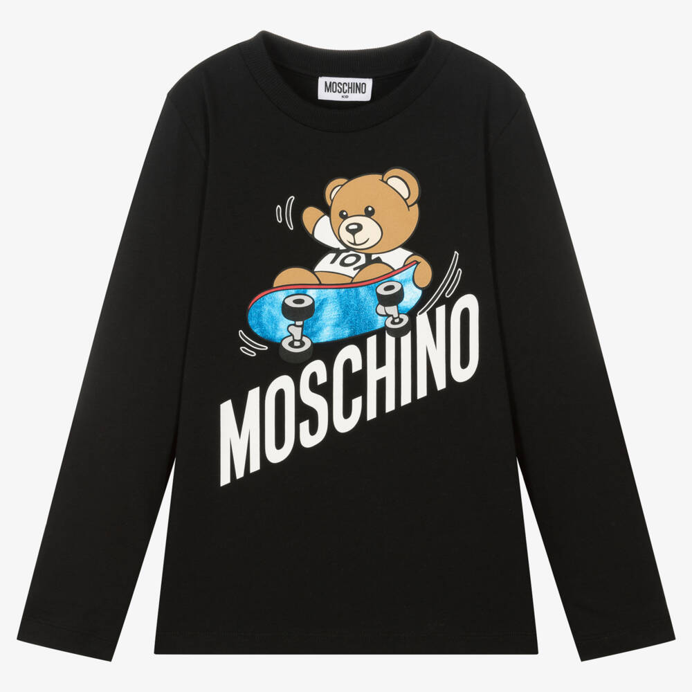 Teen boys and girls black cotton top from Italian designer Moschino Kid-Teen, defined with a slanted white logo print on the front. Made in comfortable jersey, this long-sleeved style is complete with the designer's signature Teddy Bear logo riding a skateboard on the front. Blue foil accents shimmer when they catch the light.