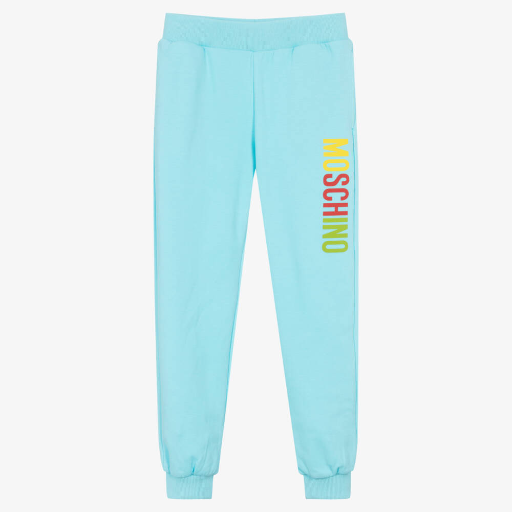 Casual turquoise blue joggers for teen boys and girls by luxury Italian brand Moschino Kid-Teen. Made in comfortable, soft cotton jersey, they have a colourful logo print on one leg and the iconic Teddy Bear logo on the back pocket. They have useful, concealed side pockets and a stretchy elasticated waist and cuffs, just right for relaxed days.