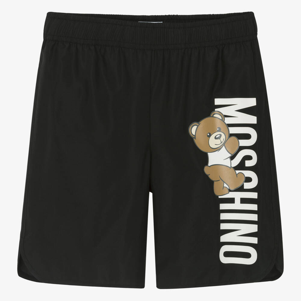 Black swim shorts for teen boys by luxury fashion house Moschino Kid-Teen. The front features a fun graphic of the iconic Moschino Teddy Bear climbing up the designer's vertical text logo, boldly printed in white. Silky smooth and lightweight, they have a soft mesh lining and a comfortable elasticated waist. There is an internal drawstring tie to adjust the fit.
