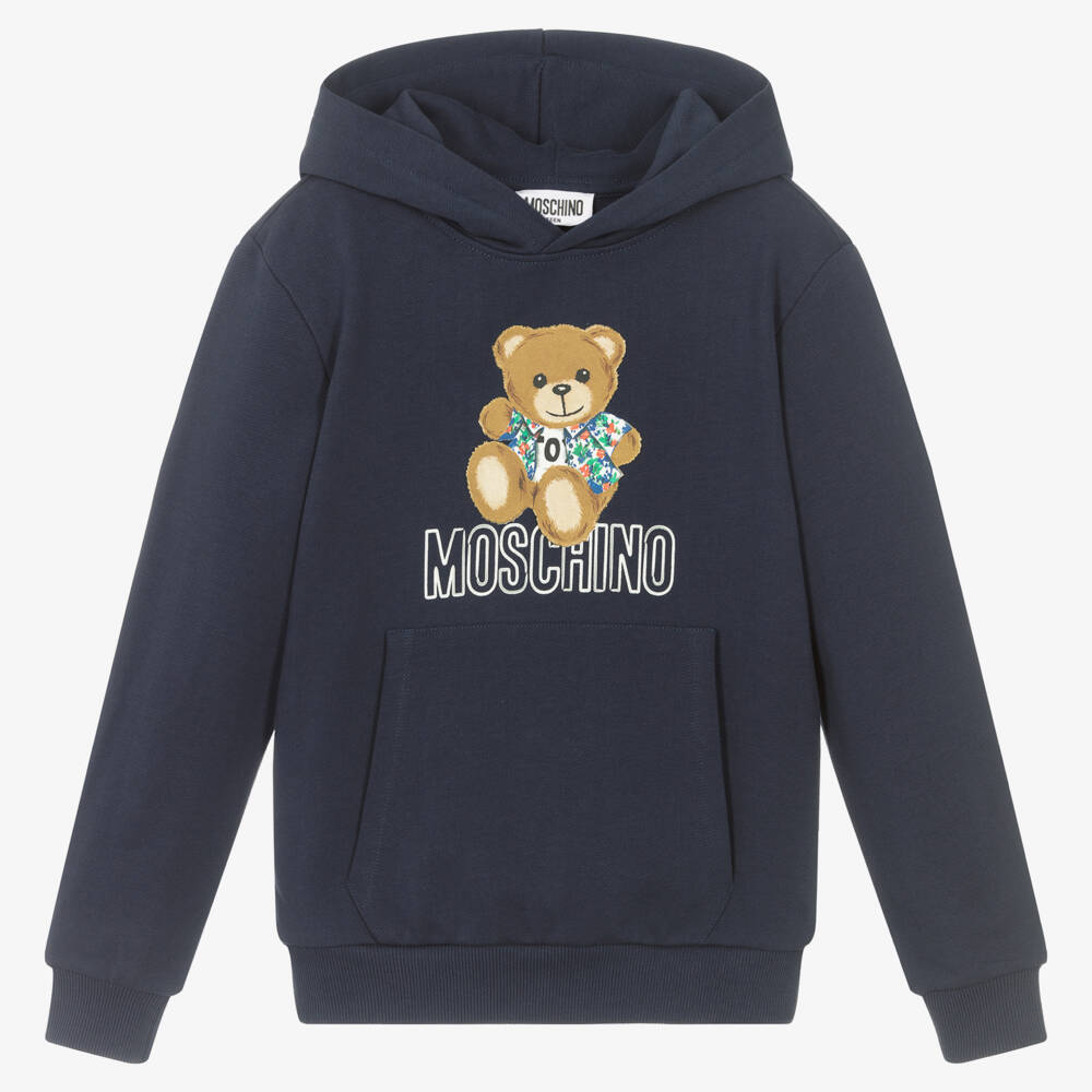 Navy blue cotton hoodie for teen boys unmistakably by luxury Italian designer Moschino Kid-Teen. It has a large, beige Moschino Teddy Bear logo on the front, wearing a colourful, floral shirt. It is made in comfortable jersey with a useful pouch pocket and neat, ribbed trims.