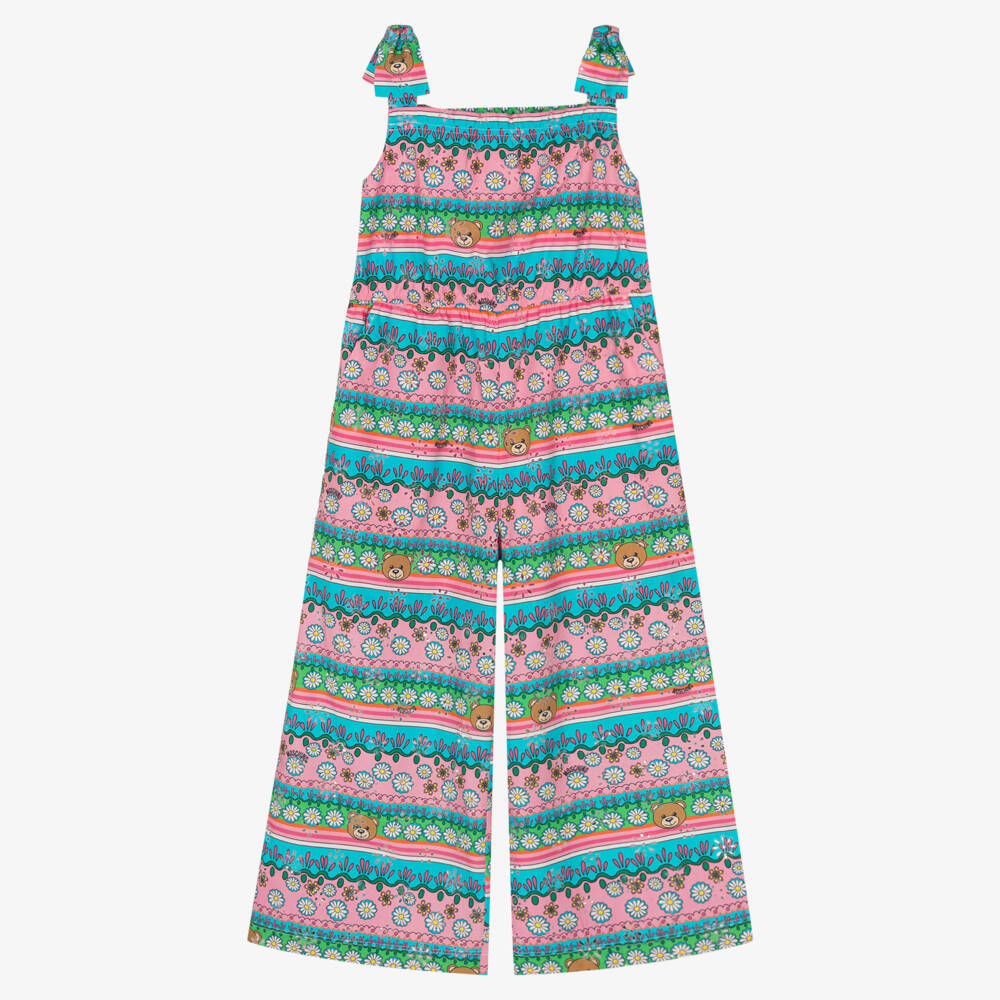 Pretty blue and pink cotton jumpsuit for teen girls, designed by Moschino Kid-Teen. Ideal for warmer days, it is patterned with a floral-inspired striped artwork with cut-out trims for a boho-inspired style. The brand's instantly recognisable Moschino Teddy Bear is printed all over. It fastens with a concealed zip on the side for seamless dressing and has stylish bows on the shoulder straps.