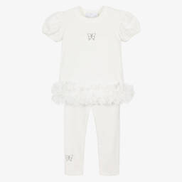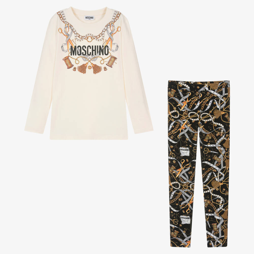 Inspired by the adult collection, an ivory and black leggings set for teen girls by Moschino Kid-Teen. The ivory tunic top has a sewing-themed chain print in gold, with fun logo details and a bold black logo across the front. The stretchy black leggings have an elasticated waistband and a matching pattern in gold and ivory. This eye-catching set is made in soft and comfortable cotton jersey.