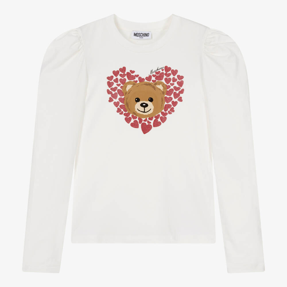 Teen girls ivory top from Italian brand Moschino Kid-Teen, made in soft and comfortable cotton jersey. Instantly recognisable, it has the Moschino Teddy Bear logo on the front, amongst romantic red heart motifs. It has long, puffed sleeves that gather beautifully on the shoulder.