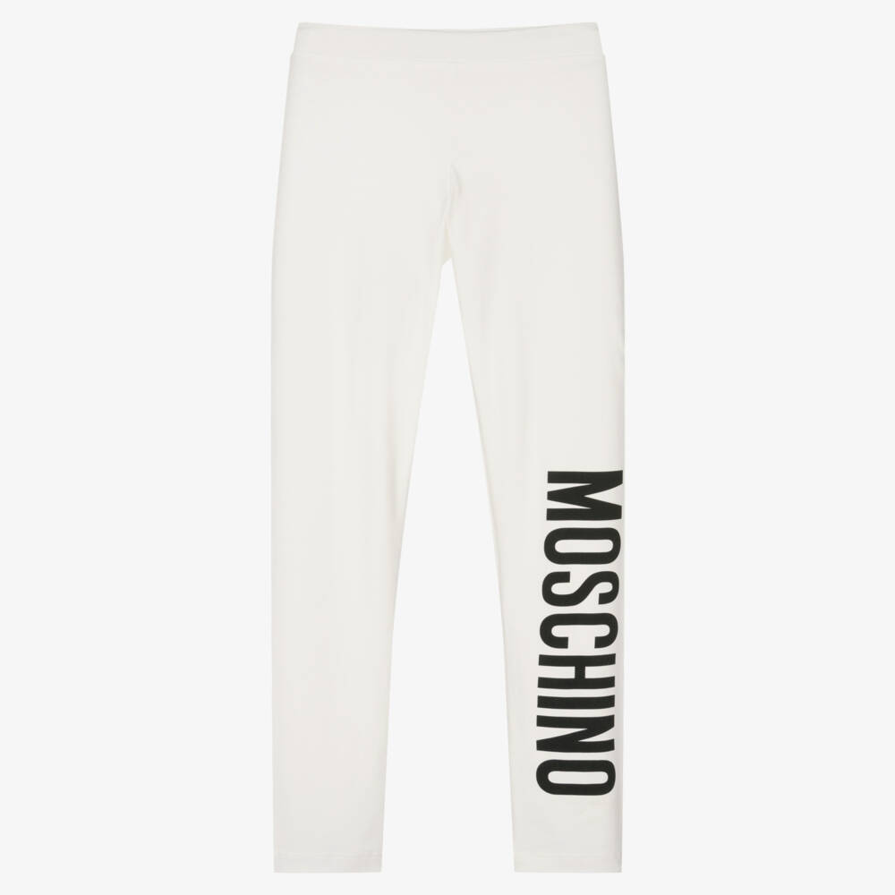 Ivory cotton leggings for teen girls by Moschino Kid-Teen. With a bold black logo print down one leg, these full-length leggings are made in stretchy cotton jersey with an elasticated waist, for comfort and fit.