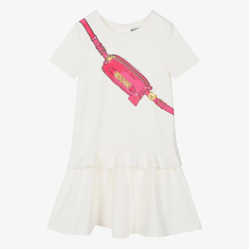 Designed by Moschino Kid-Teen, this ivory dress for teen girls is sure to make a stylish statement. The stand-out, fuchsia pink and gold trompe l'oeil bag print creates a cool, accessorised illusion. For a feminine silhouette, it has a tiered, ruffle skirt. It neatly fastens with a concealed zip on the back.