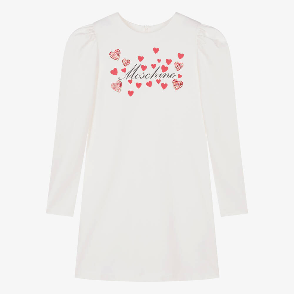 Teen girls ivory dress by Moschino Kid-Teen, with a feminine vibe. A bold, red heart motif is stamped on the chest for a branded look, embellished with glamorous red diamantés to elevate. This easy-to-wear, casual style has a relaxed shape and is made in soft viscose-blend jersey for comfort. There is a concealed zip fastening on the back for a seamless finish.