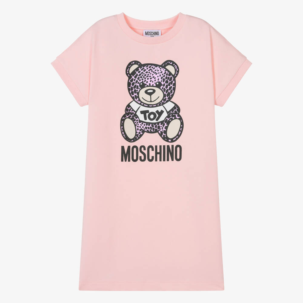 From luxury designer Moschino Kid-Teen, a pink cotton jersey dress for teen girls. Making an instant statement, this T-shirt dress has the fashion house's iconic Moschino Teddy Bear logo printed on the front. It has a ribbed crew neck and short sleeves with dropped shoulders for a relaxed silhouette.
