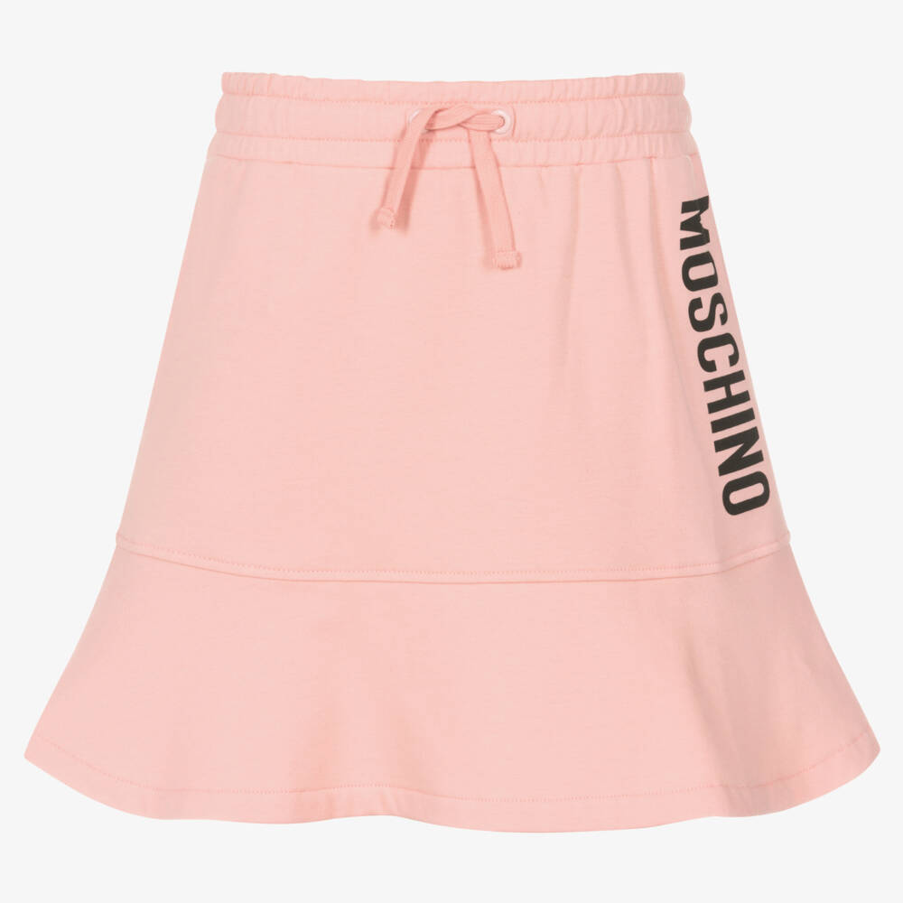A casual pink skirt for teen girls by Italian label Moschino Kid-Teen, characterised with a black logo print on one side. Great for days in the sun, this shorter-length skirt has a drawstring waist and side seam pockets for small essentials. For added comfort, it is made from soft and stretchy cotton jersey with a fleecy inside.