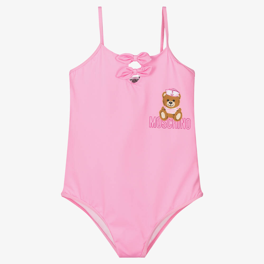 Bubblegum pink swimsuit for teen girls by luxury Italian designer Moschino Kid-Teen. Ideal for making a statement on the beach or poolside, it has a beige, nautically-inspired Moschino Teddy Bear logo on the front. Silky and stretchy, it is fully lined for comfort and has pretty bow detailing on the front.