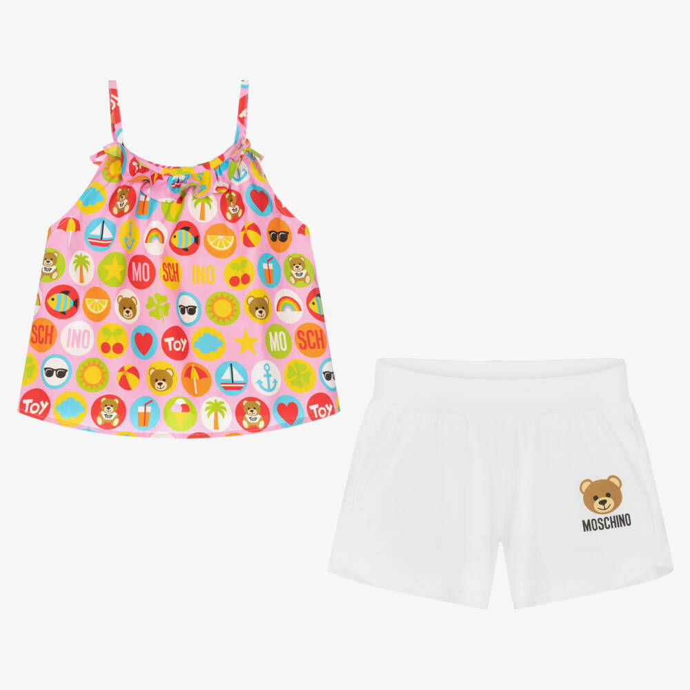 Pink and white shorts set for teen girls by Italian brand Moschino Kid-Teen, featuring the instantly recognisable Moschino Teddy Bear logo. Made in lightweight cotton poplin, the pink top has narrow shoulder straps and ruffle detailing on the neckline. It is designed in a vibrant, retro-inspired print with a summery feel. The cotton piqué shorts bring a sporty element to the set, with an elasticated waistband, handy side pockets, and a matching logo print on the thigh.