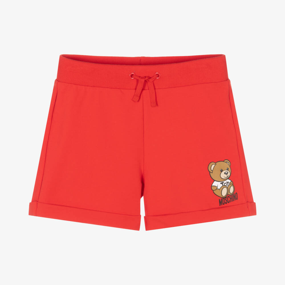 Casual red shorts for teen girls by Moschino Kid-Teen, ideal for laidback looks. They are printed with the instantly recognisable Moschino Teddy Bear logo near the hem and have a drawstring waist.