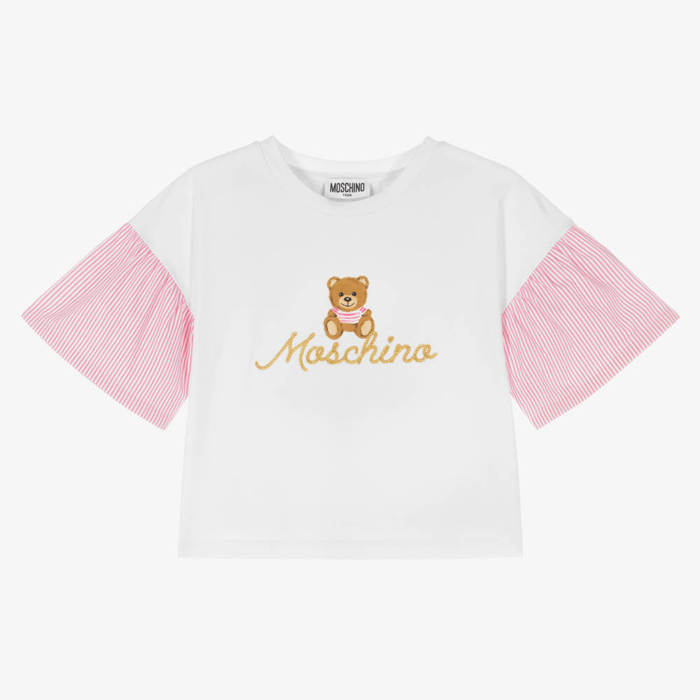 From Moschino Kid-Teen, white T-shirt for teen girls with the iconic Moschino Teddy Bear above a gold embroidered logo on the front. For a modern silhouette, it has a boxy fit and eye-catching pink and white striped fluted sleeves. Made in soft cotton jersey, it is cool and comfortable to wear.