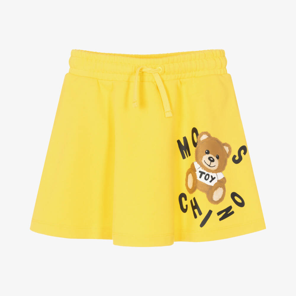 Teen girls yellow skirt designed by Moschino Kid-Teen, inspired by the brand's logos. Printed with the signature Moschino Teddy Bear logo print on the front, it has a stretchy drawstring waist guaranteeing comfort and style. This full skirt also has useful side seam pockets.