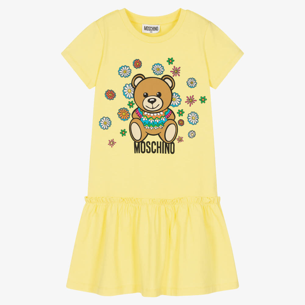 Fun bright yellow dress for teen girls, designed by Moschino Kid-Teen. Embellished with glamorous silver diamantés, it has a recognisable, playful Moschino Teddy Bear logo print on the front. It has a relaxed dropped waist and is made in soft cotton jersey, making it ideal for casual days.