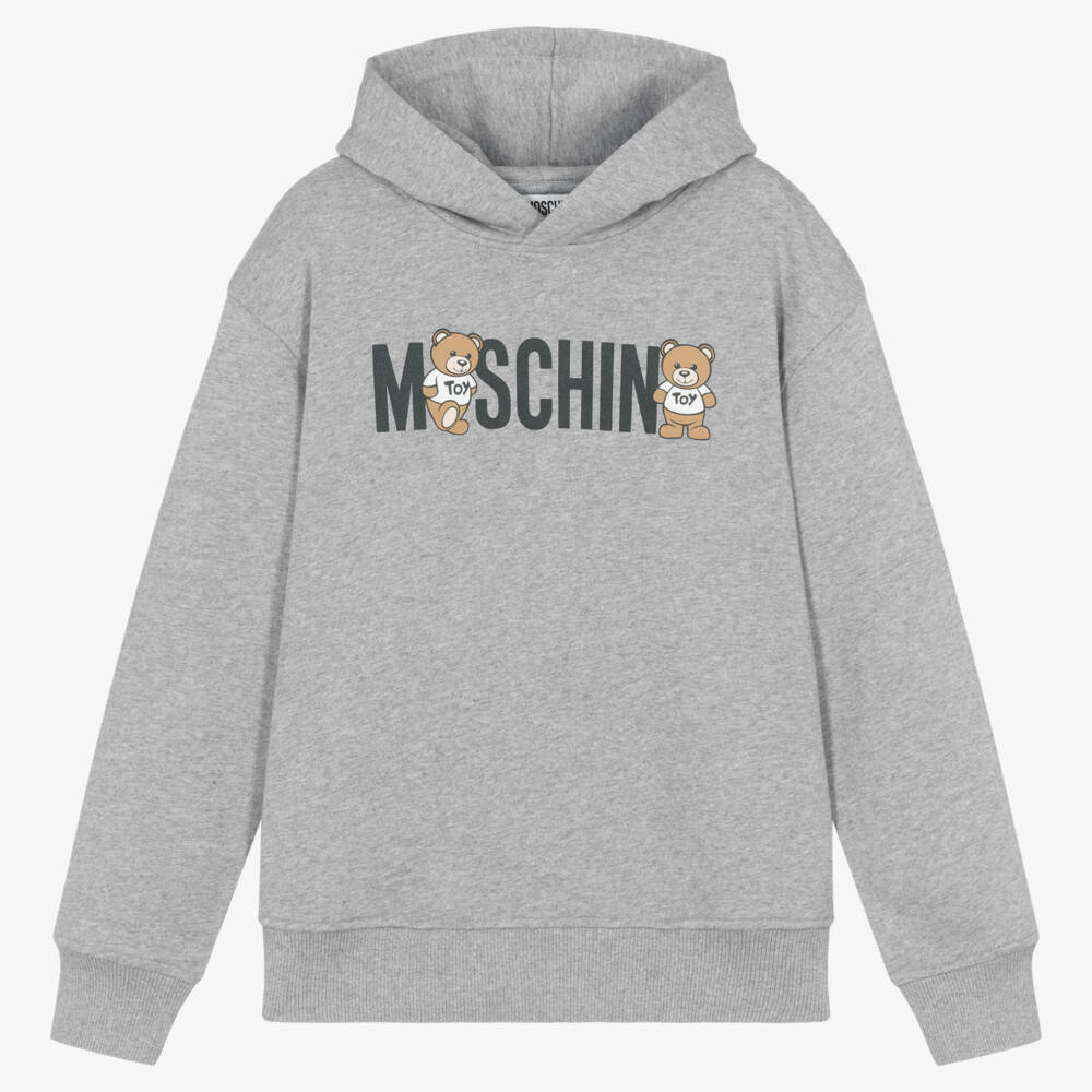 Grey marl cotton hoodie for teen boys and girls, by luxury Italian designer Moschino Kid-Teen, with a large black statement logo and the iconic Moschino Teddy Bears printed on the front. Relaxed and casual, it is made in comfortable jersey with a soft, brushed feel inside and has useful, concealed side pockets. The hoodie has neat, ribbed trims for extra warmth.