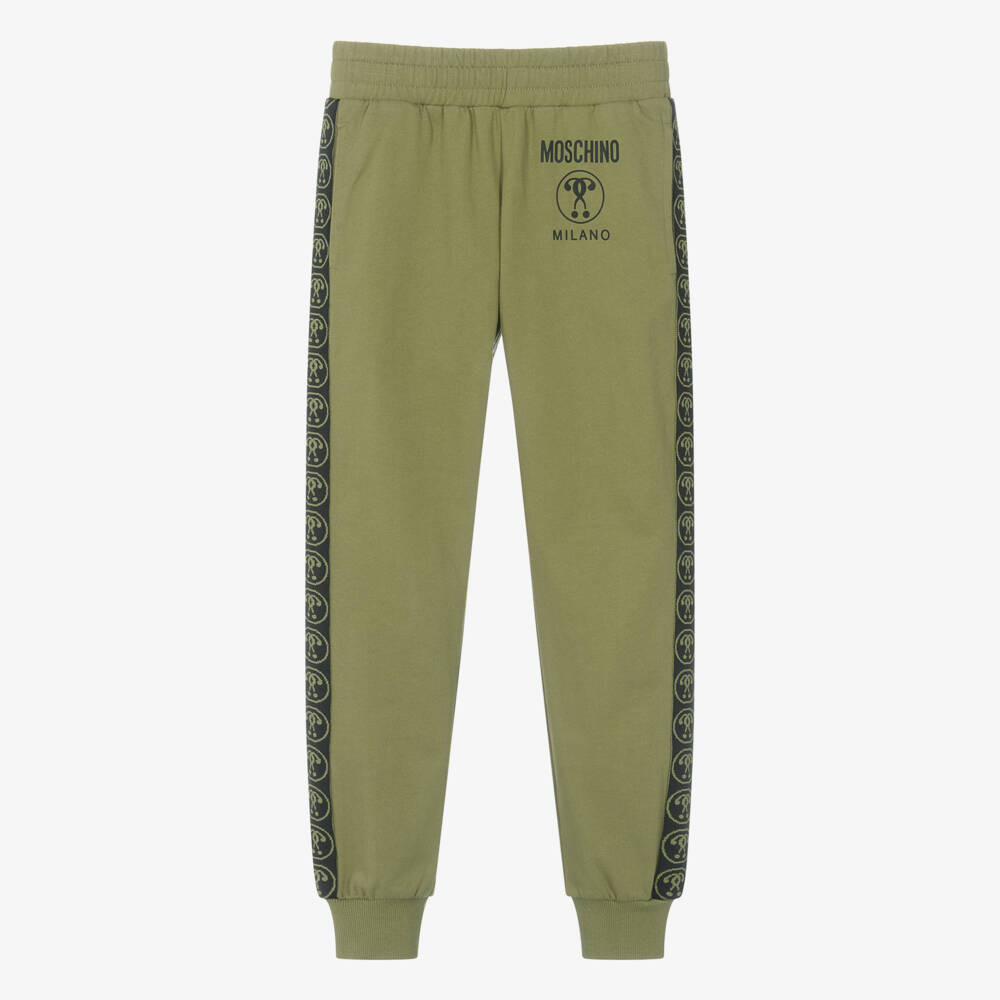Designed by luxury brand Moschino Kid-Teen, these khaki green Mini-me joggers are for teen boys and girls. For a cool designer look, there is a black rubberised Double Question Mark logo on the front with matching details on the woven tape trims down each side. Made from mid-weight cotton jersey with a soft fleecy inside, they have side seam pockets and a drawstring fastening on the inside of the elasticated waistband.