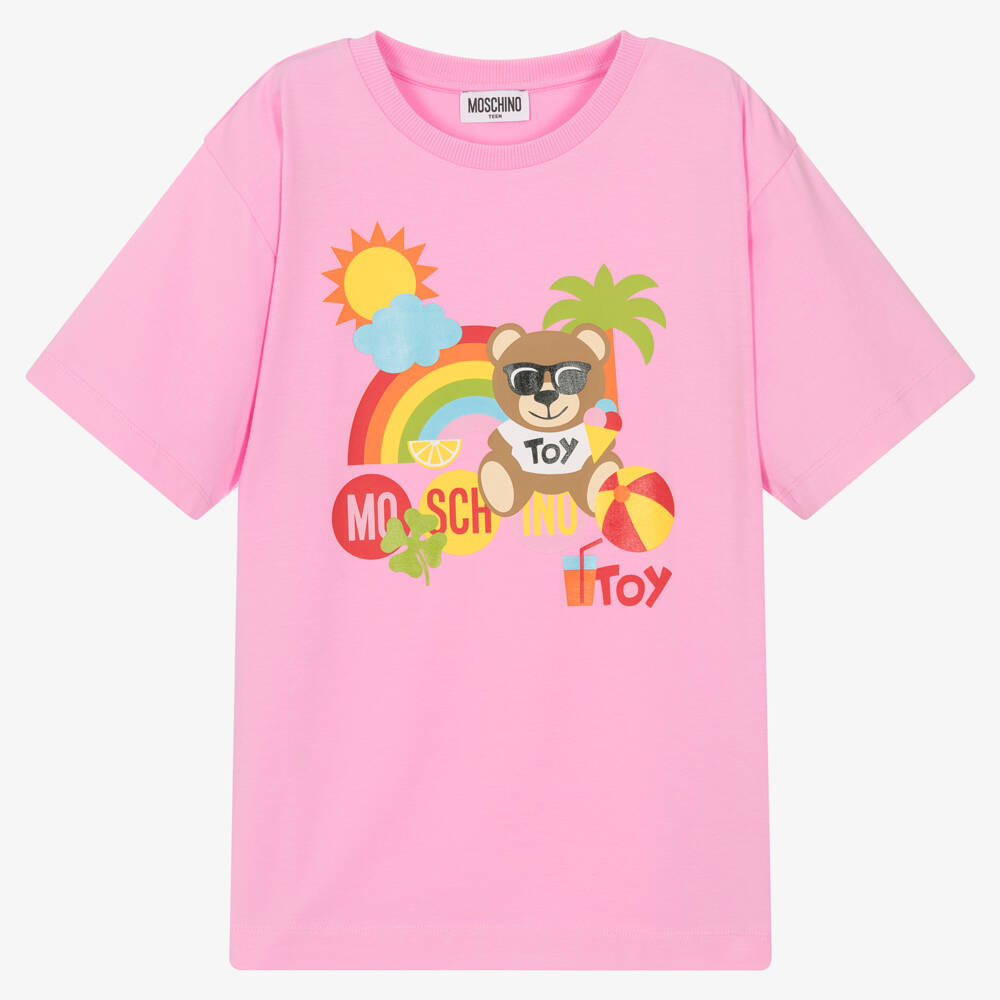 Pink oversized T-shirt for teen girls by Moschino Kid-Teen. For a seasonal twist on the classic style, this maxi T-shirt has a fun holiday-inspired Moschino Teddy Bear print on the front, relaxing in the sun with an ice cream and beach ball. Cool and easy to wear, it is made in comfortable cotton jersey with a ribbed crew neckline.