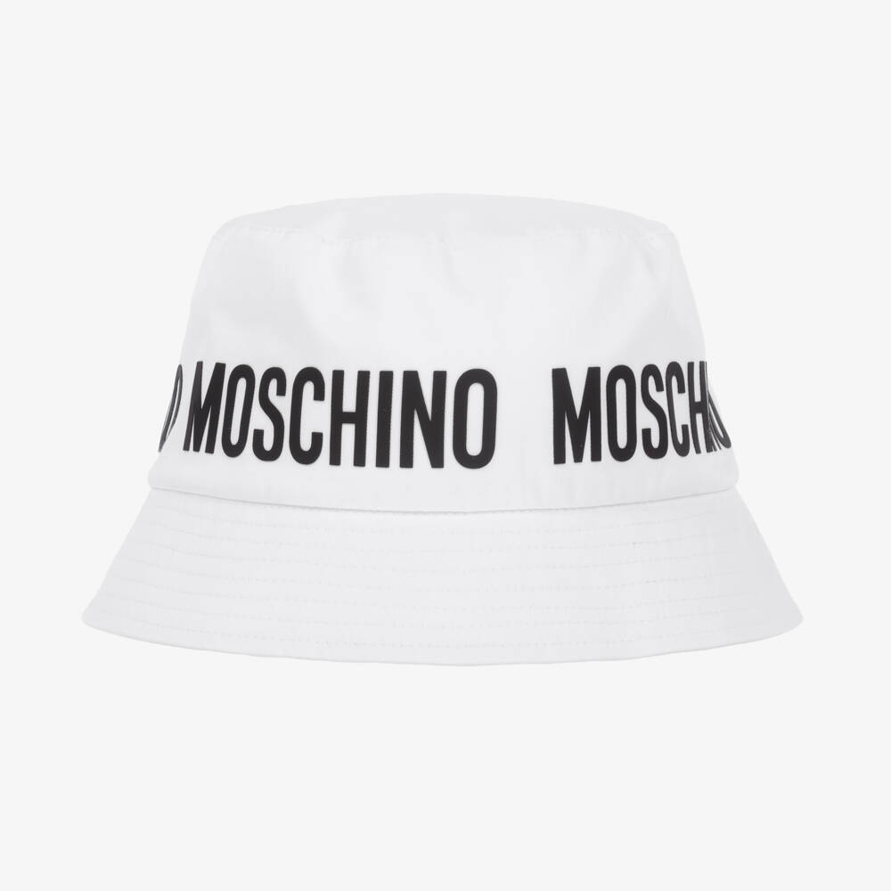 White bucket hat for teen boys and girls by Moschino Kid-Teen, signed with bold logo branding in the label's signature black font. Ideal for casual styling or days spent in the sun, this cotton hat has a lightweight lining and tonal stitching on the brim.