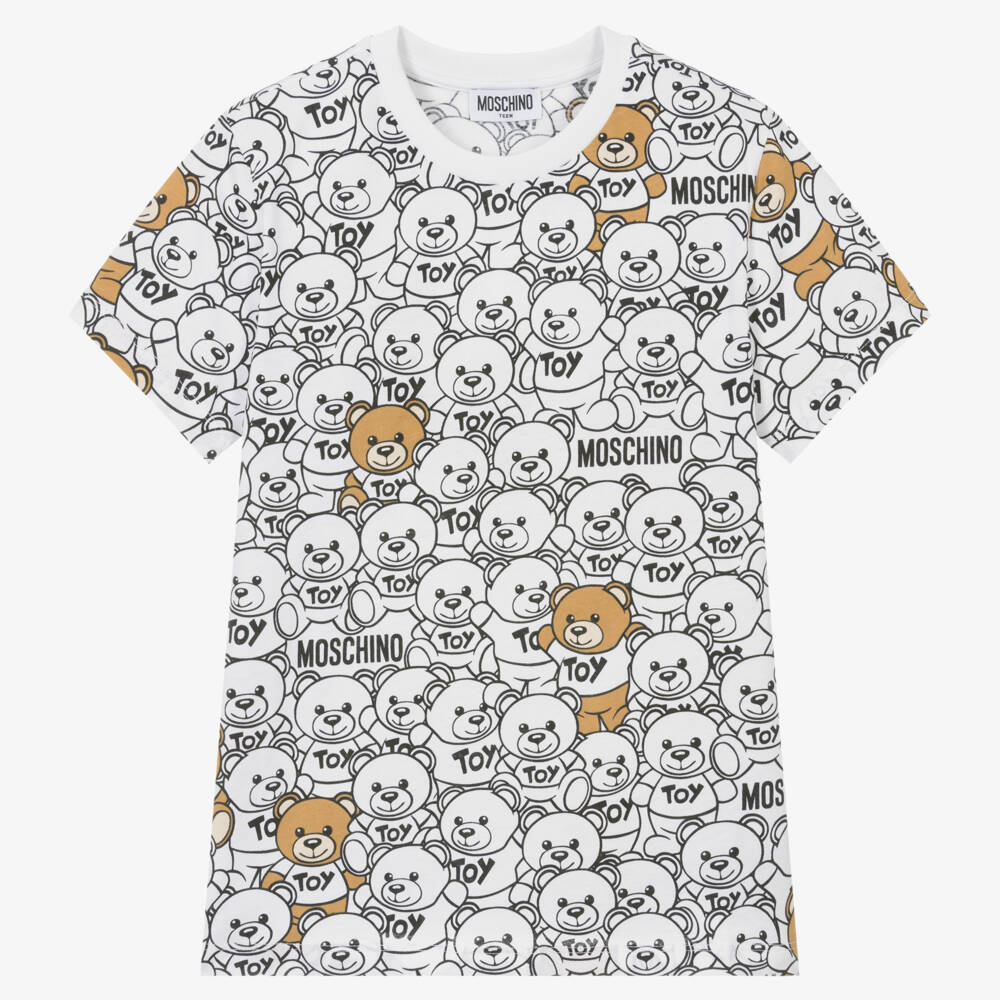 Unmistakably by luxury fashion house Moschino Kid-Teen, a white cotton T-shirt for teen boys and girls. It features the brand's iconic Moschino Teddy Bear logo in an all-over black and beige print. Casual and comfortable, this ribbed crew neck tee is made in soft jersey.