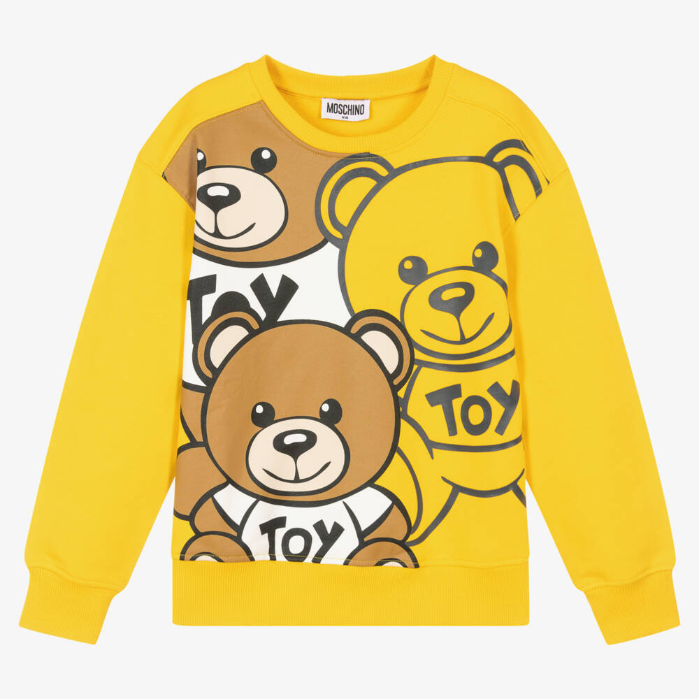Yellow cotton sweatshirt for teen boys and girls, unmistakably by luxury Italian designer Moschino Kid-Teen, with a montage of the brand's iconic Teddy Bears printed on the front, one in a grey outline. This casual, regular fit sweatshirt is made in soft, comfortable cotton jersey with a cosy, fleecy inside, just right for cooler days.