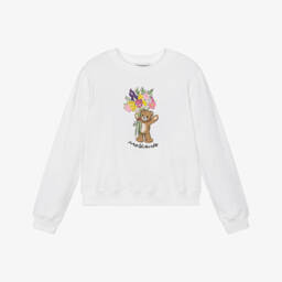 White cotton sweatshirt for baby boys and girls by Moschino, with a playful design of the brand's signature Teddy Bear and logo. Ideal for layering, this casual style is made in soft, comfortable jersey with useful popper fastenings on one shoulder.