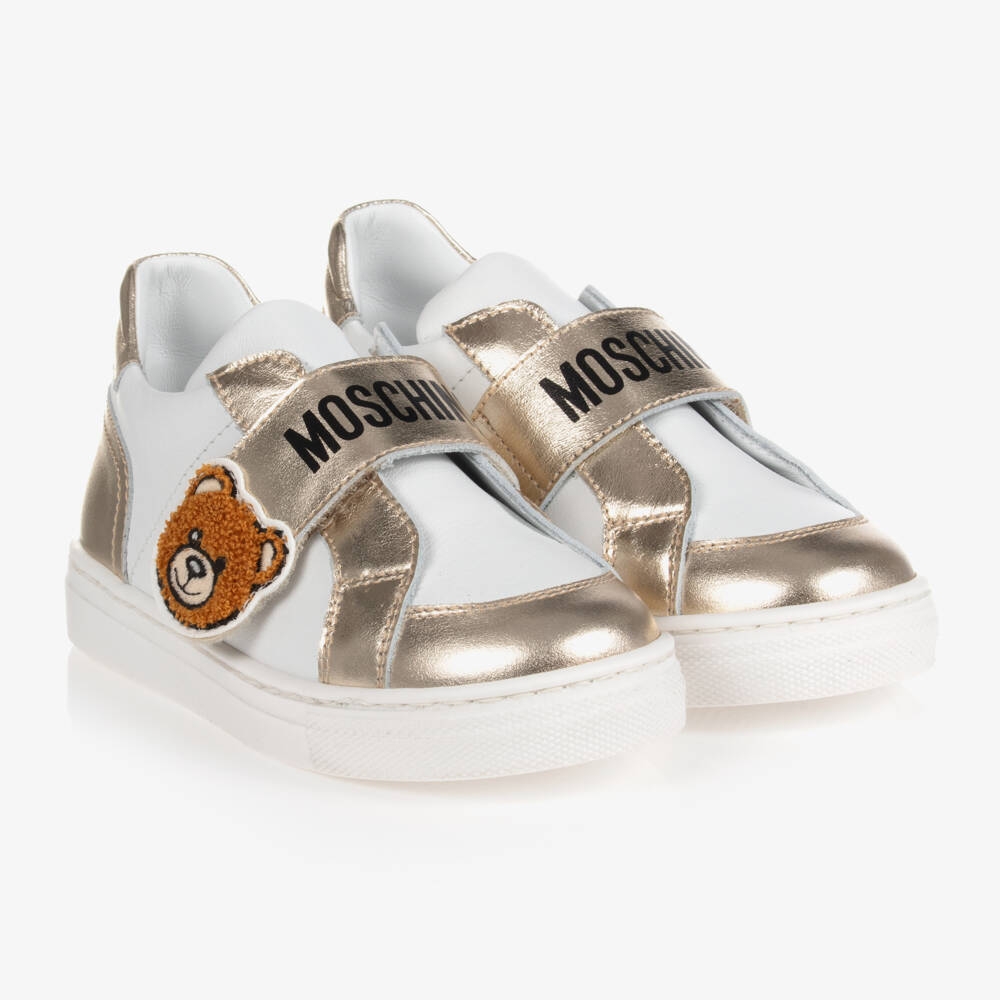 White and gold leather sneakers for girls by Moschino Kid-Teen. Soft and supple, they have a velcro fastening foot strap decorated with a teddy fleece bear motif. They have silver leather trims and are fully lined in leather, with a leather inner sole and non-slip rubber outer sole.