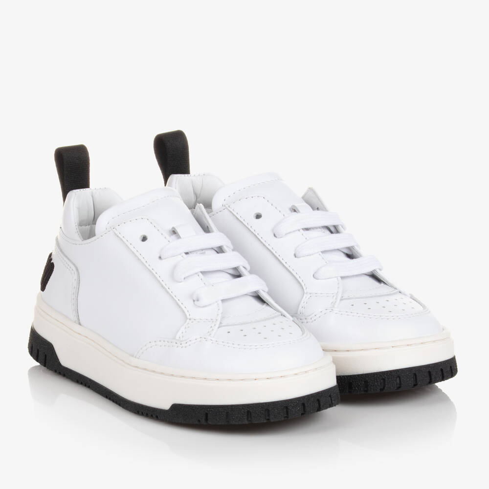 White leather trainers for boys and girls by luxury brand Moschino Kid-Teen, with a bold black logo embroidered across the heel. Lined in soft leather, these trainers have breathable perforations on the toe and fasten with laces. They have a thick black and white non-slip rubber outsole for good grip.